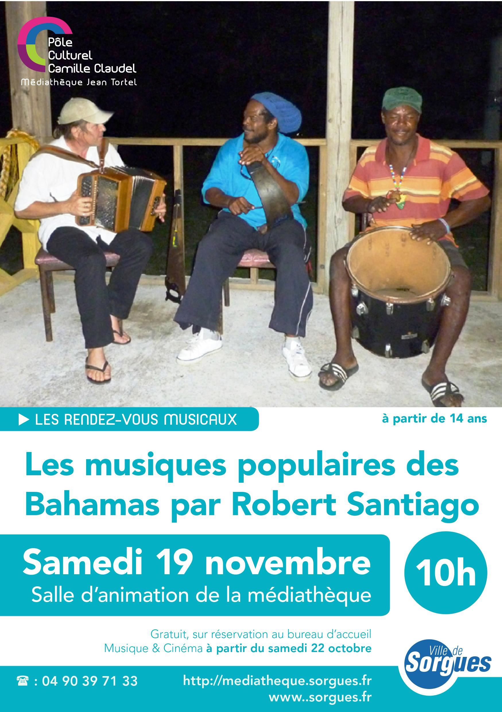 Le musicien Robert Santiago, spécialiste des musiques populaires d’Amérique latine et des Caraïbes, vous propose un tour d’horizon de ces différents styles ; la conférence présentera également les grandes voix du blues bahamien (Joseph Spence, Blind Blake), du Calypso (Georges Symonette, Lord Cody, Ritchie Delamore) ou du Goombay (Ed Moxey, « Peanuts » Taylor, Ronnie Buttler, Phil Stubbs).