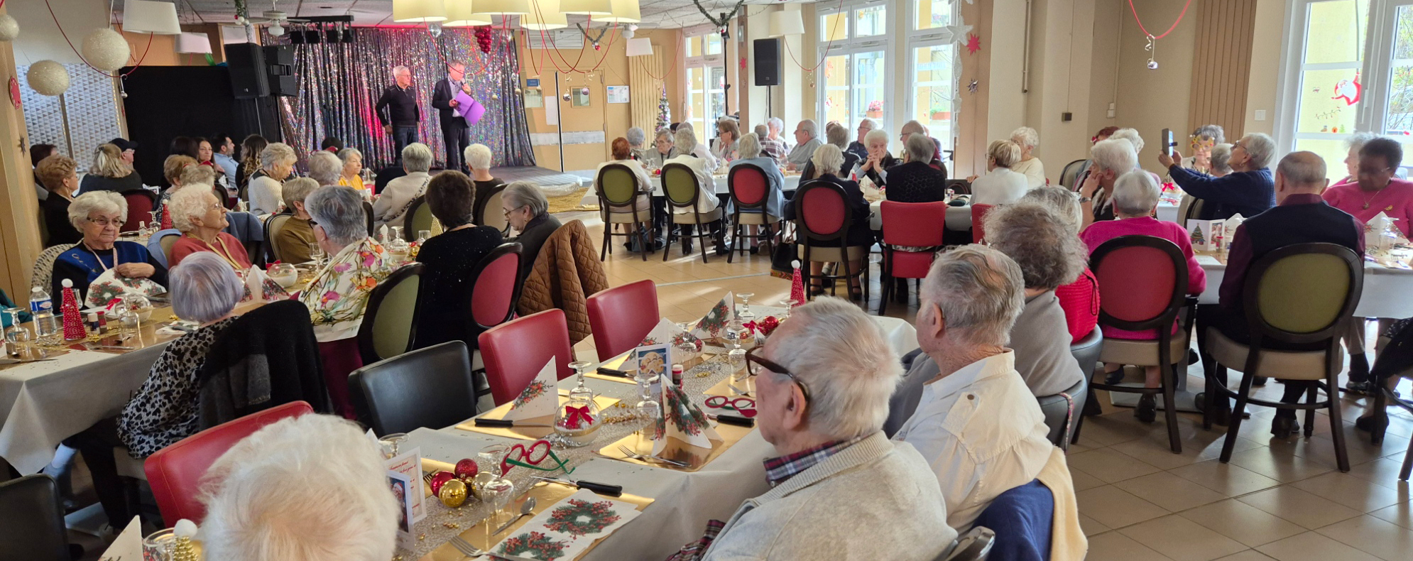 Le 11 décembre, la Ville a également partagé un moment chaleureux avec les résidents du foyer logement Le Ronquet à l’occasion du traditionnel repas de Noël. Au total, 63 personnes ont savouré un menu festif, tandis que 5 plateaux-repas ont été portés en chambre pour les résidents hospitalisés à qui nous adressons toutes nos pensées. L’après-midi a été joyeusement animé par la troupe Idyllium Cabaret, qui a proposé un spectacle pétillant sur le thème des années 80.
