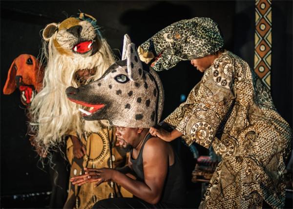 Sur la scène, des masques d’animaux, des instruments de musique africains, une case…