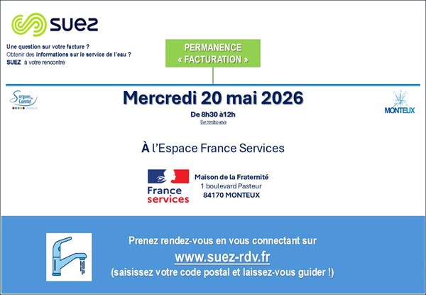 Le mercredi 20 mai, un agent de SUEZ sera présent à l’Espace France Service de Monteux (1 boulevard Pasteur), de 8h30 à 12h, pour répondre aux questions concernant votre facturation.